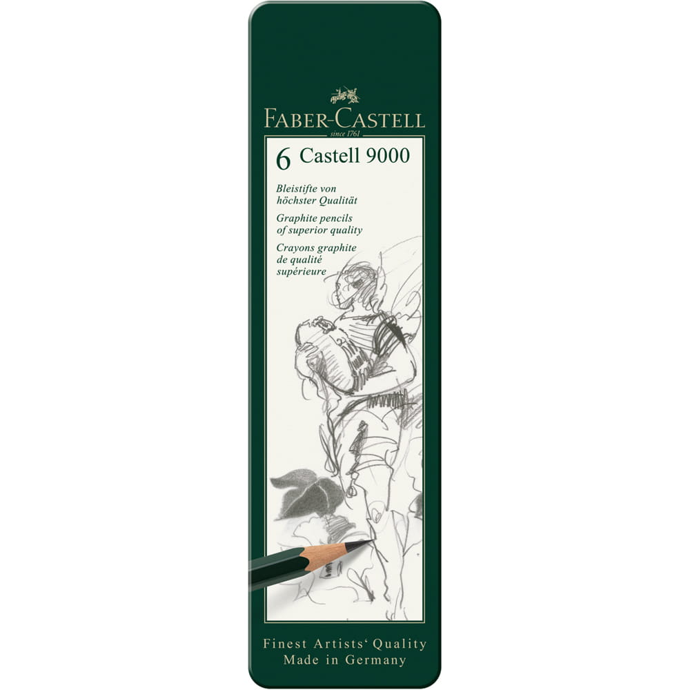W pracy artystycznej – niezależnie od stylu i techniki – podstawą jest dobry ołówek. Faber-Castell seria 9000 to najwyższa jakość. Te wysokiej jakości ołówki o tradycyjnym wyglądzie produkowane są w gamie 16 twardości: od ostrych i precyzyjnych 6H do miękkich, łatwo rozmazujących się 8B. Dzięki sześciokątnej obudowie są wygodne w użyciu. Łatwo się je temperuje, tworząc ostrą, precyzyjną końcówkę.