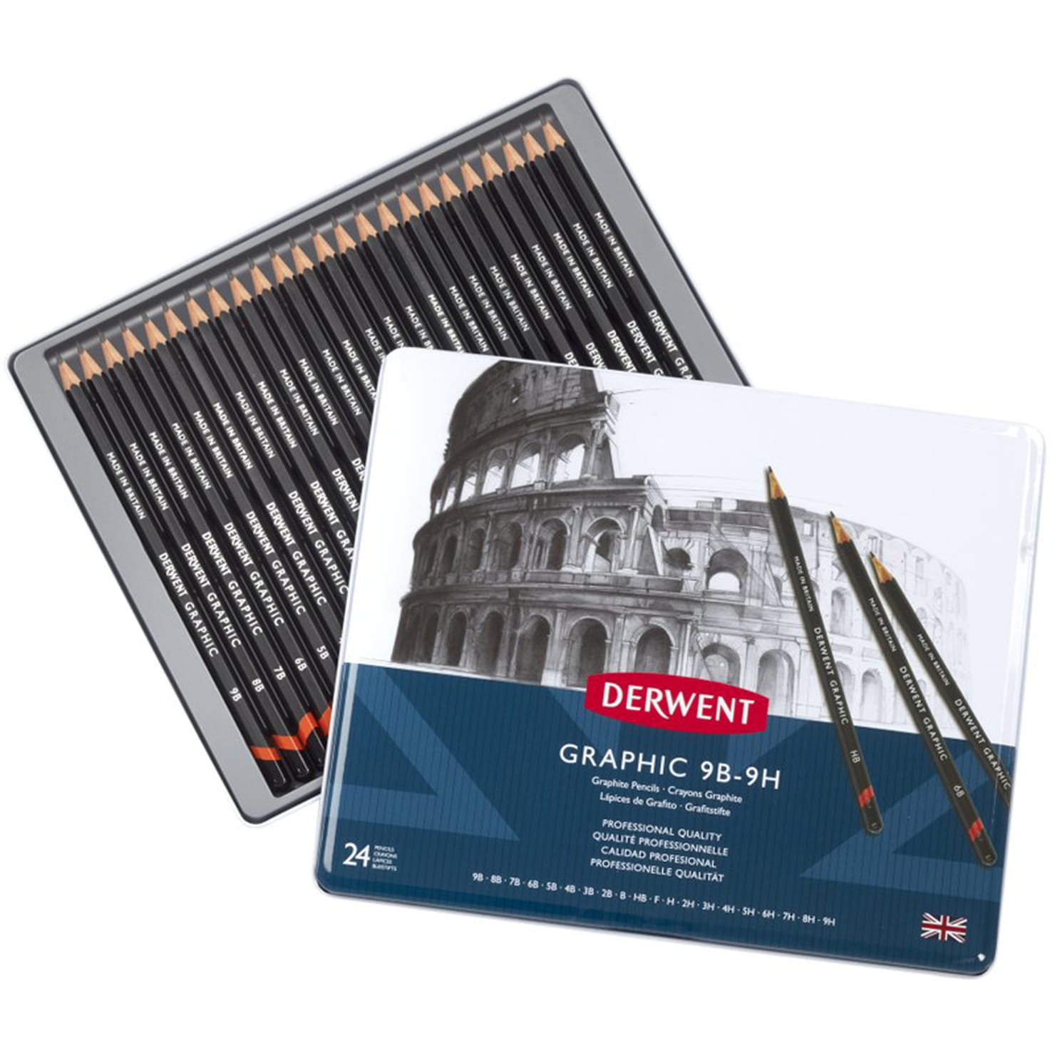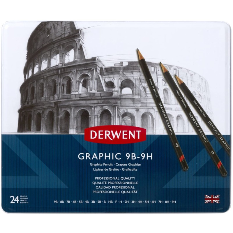 Komplet w solidnym metalowym opakowaniu zawiera 24 ołówki Derwent Graphic: 9H, 8H, 7H, 6H, 5H, 4H, 3H, 2 x 2H, H, F, B, 2 x HB, 2 x 2B, 3B, 2 x 4B, 5B, 6B, 7B, 8B i 9B