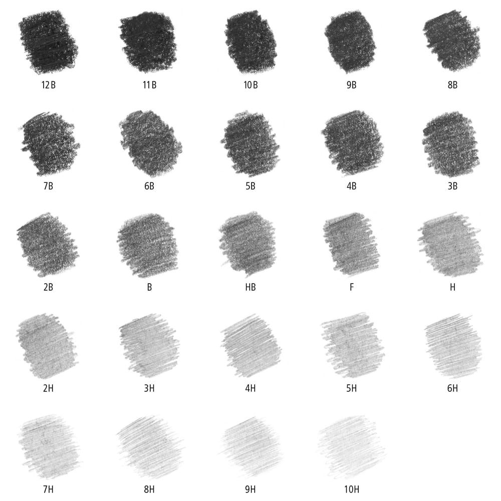 Zestaw 24 szt - zawiera 24 stopni twardości: 12B, 11B, 10B, 9B, 8B, 7B, 6B, 5B, 4B, 3B, 2B, B, HB, F, H, 2H, 3H, 4H, 5H, 6H, 7H, 8H, 9H, 10H.