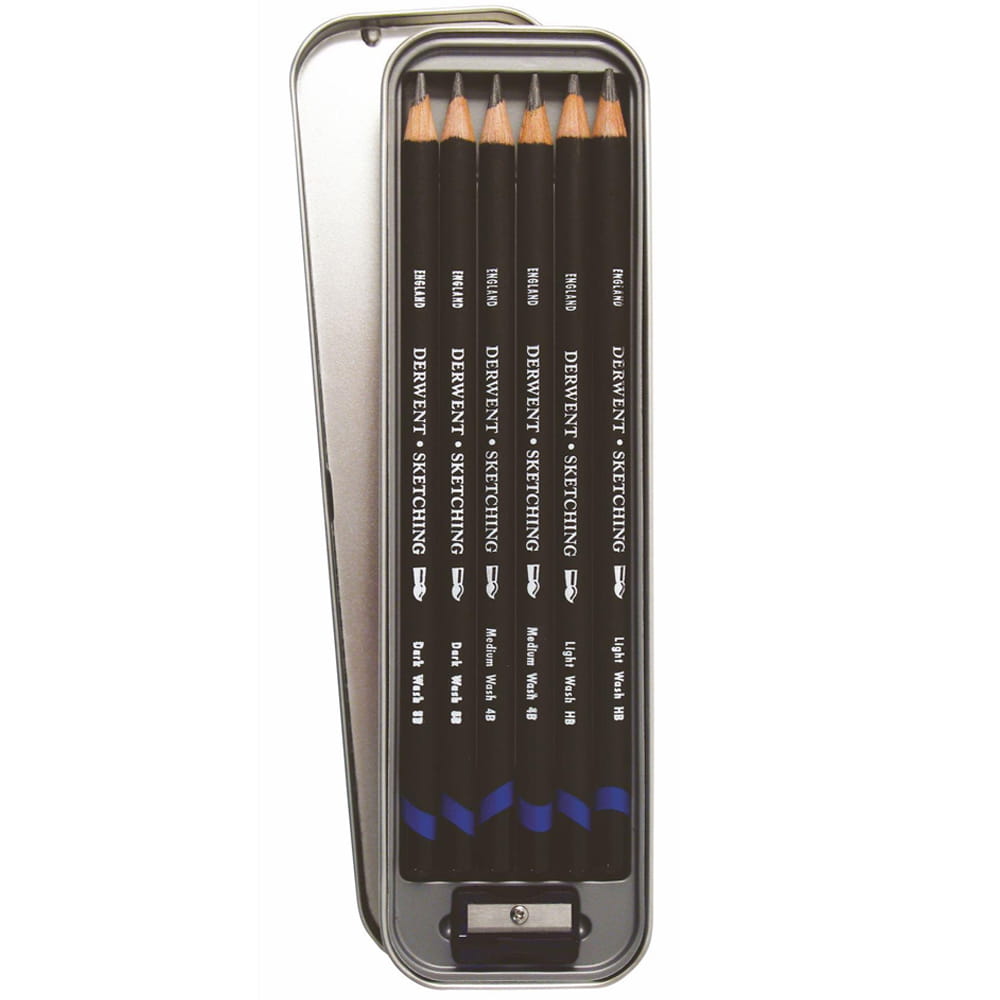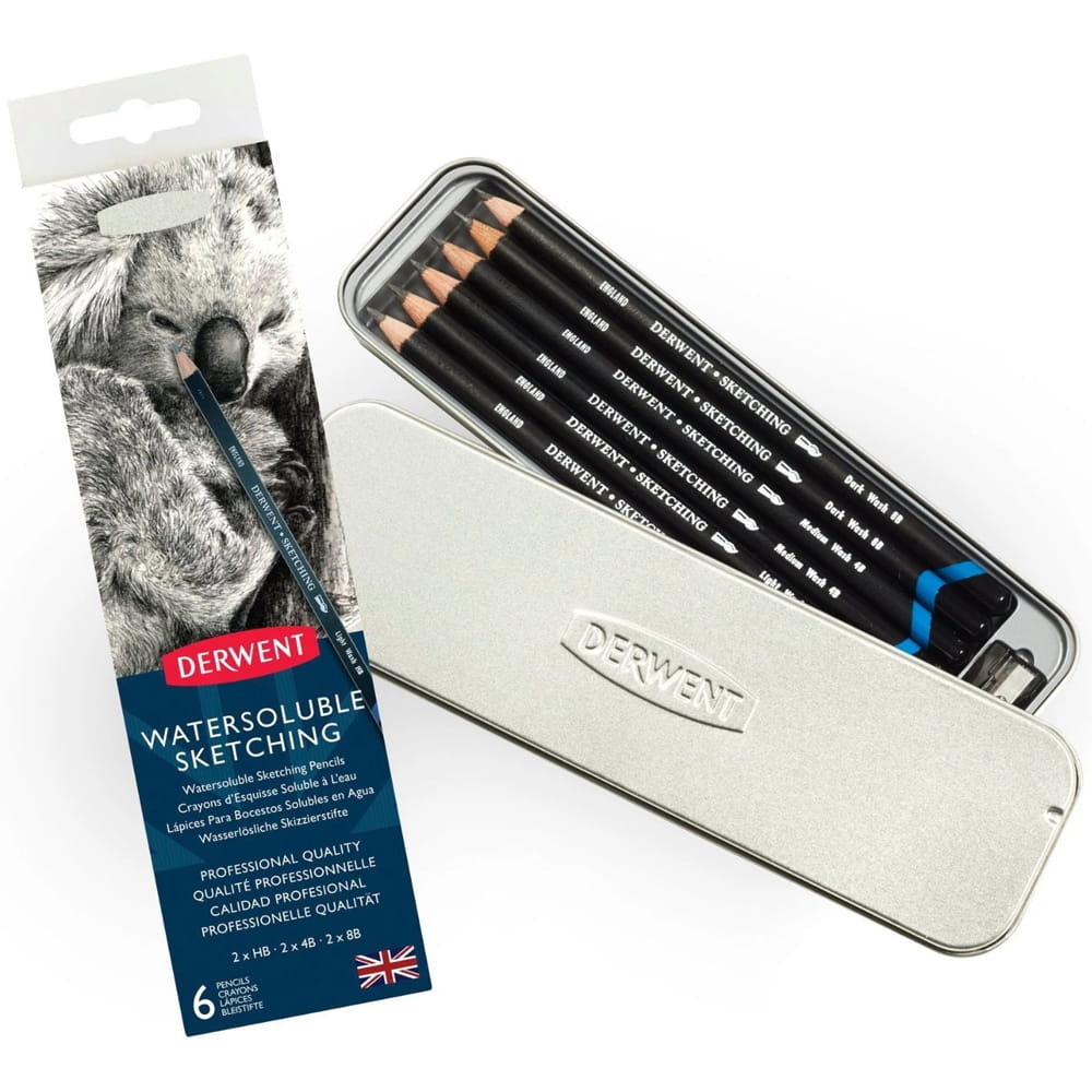 Metalowe pudełko zawieraja 6 ołówków Derwent Watersoluble Sketching: 2 x HB, 2 x 4B and 2 x 8B oraz temperówkę