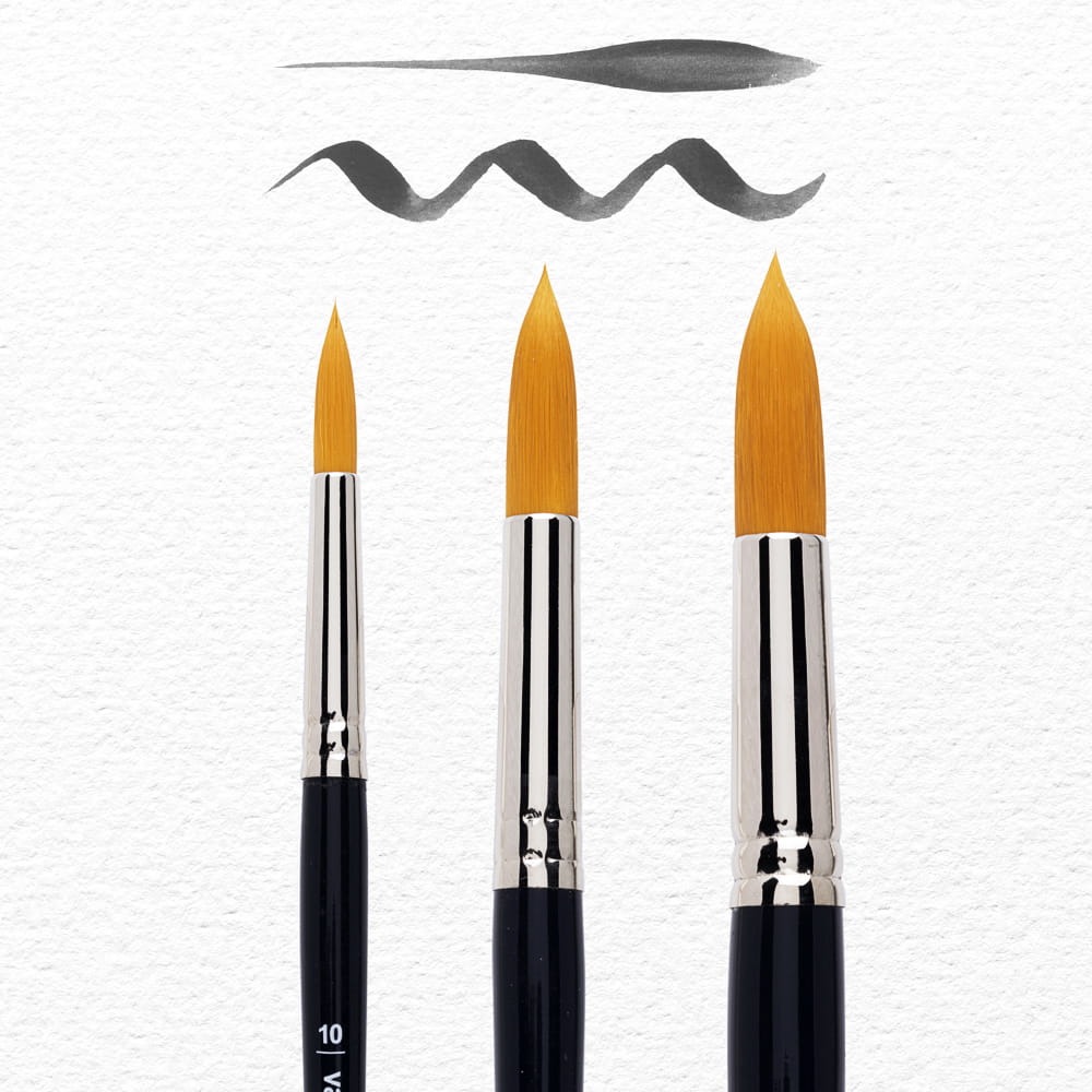 Zestaw starannie wykonanych, ręcznie ukształtowanych pędzli do akwareli idealnych dla artystów na każdym poziomie zaawansowania. Pędzle mają elastyczne i odporne na zużycie włosie. Złoty włos syntetyczny potrafi wchłonąć dużą ilość wody. Ma okrągły kształt z bardzo cienką końcówką stworzoną do szczegółowej, precyzyjnej pracy. Pędzle bardzo dobrze zachowują swój kształt po każdym użyciu. Ich rączki zostały zaprojektowane z myślą o maksymalnej wytrzymałości i komforcie użytkowania.