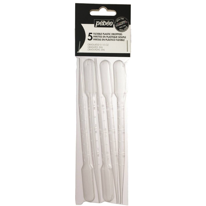 Zestaw 5 sztuk elastycznych pipet 3 ml od Firmy Pebeo. Pipety plastikowe to wygodne akcesorium do pobierania farb z pojemnika oraz ich aplikacji.