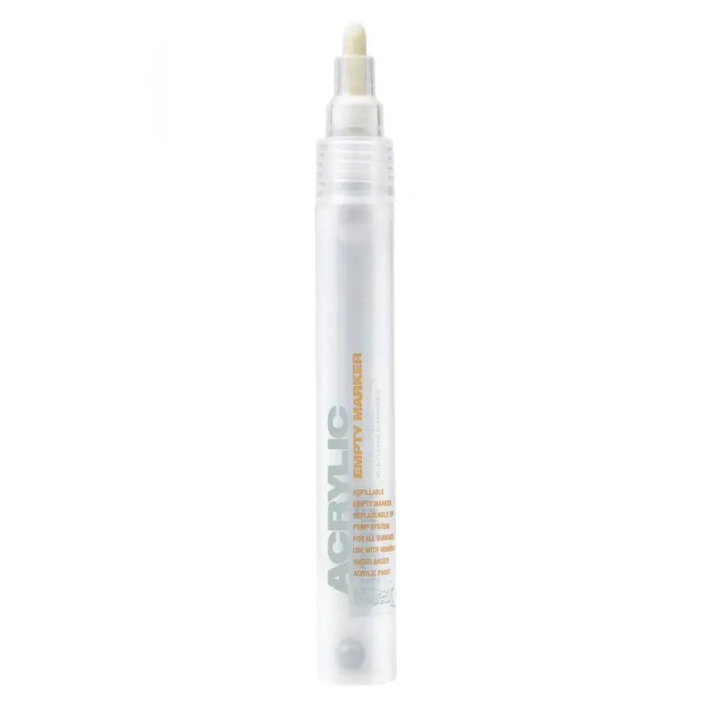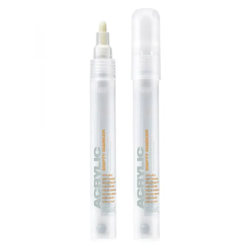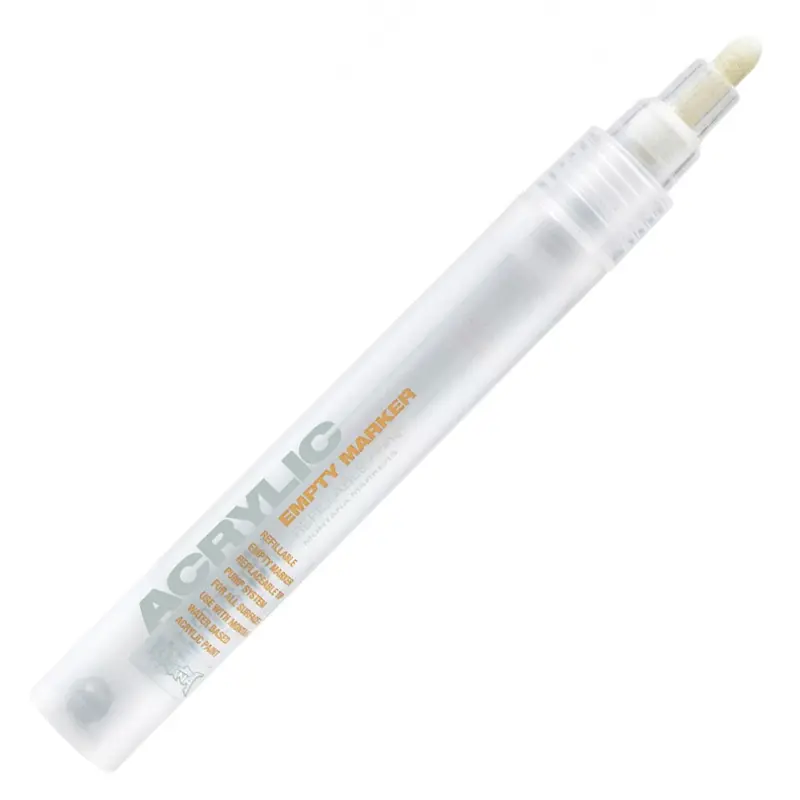 Montana ACRYLIC EMPTY Marker 2 mm to wysokiej jakości marker do wielokrotnego napełniania, wyposażony w zaawansowany mechanizm pompująco-zaworowy zapewniający precyzyjne dozowanie farby. Przezroczysta obudowa ułatwia kontrolę poziomu zawartości, co pozwala na efektywne zarządzanie ilością używanego medium.
