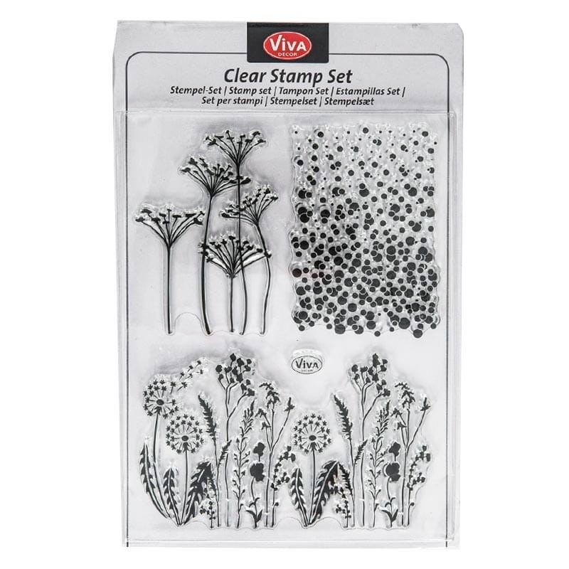 Zestaw przezroczystych silikonowych stempli dostępny jest na blistrze o wymiarach 22 x 14,5 cm.
