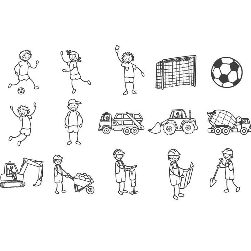 Zestaw stempli drewnianych 15 szt. + tusz, Piłkarze i budowa