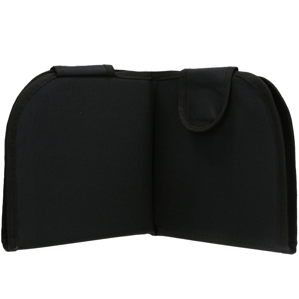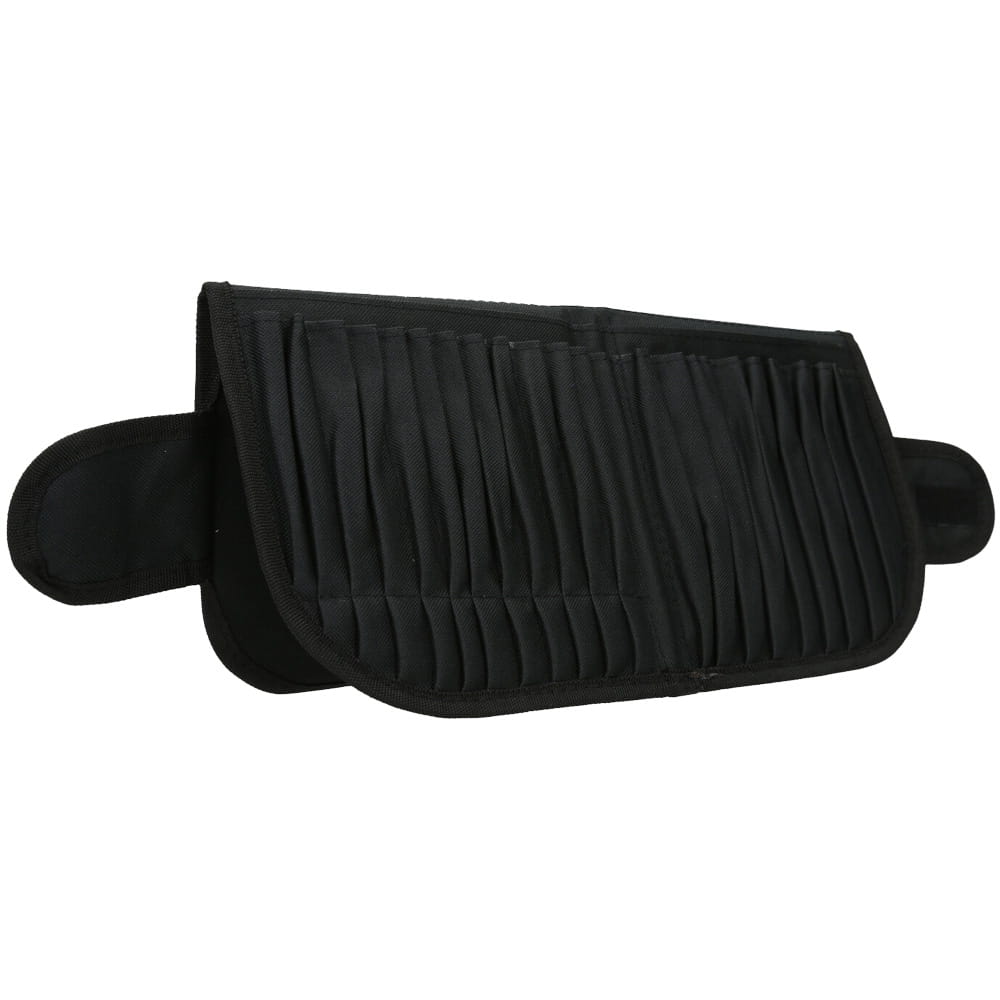 Stojący piórnik z materiału. Piórnik jest usztywniany, zapinany na dwa rzepy i dodatkowo łamany tak aby można było go postawić. Format 19x18 cm. Kolor czarny. Idealny jako organizator i miejsce do przechowywania pędzli. Etui pomieści 21 pędzli.