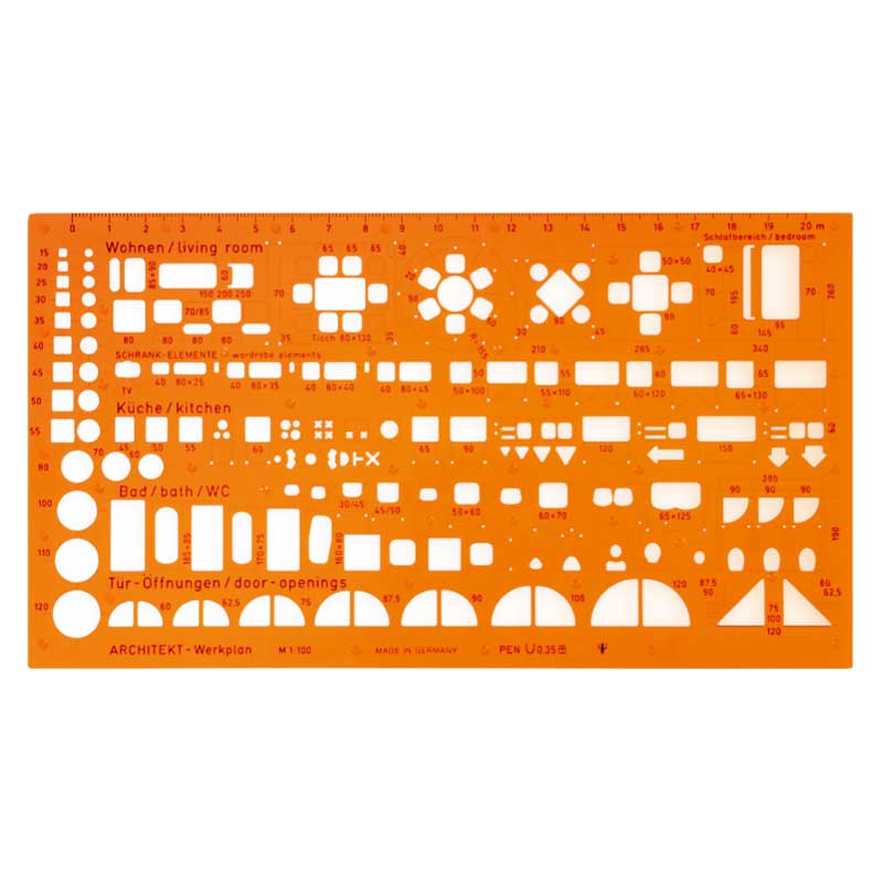 Szablon o grubości ok 1,2 mm z super elastycznego przezroczystego tworzywa w kolorze pomarańczowym posiada wypustki, które unoszą szablon ponad powierzchnię rysunku. W szablonie znajdują się otwory z symbolami architektonicznymi. Zawiera kształty takie jak elementy sanitarne, elementy umeblowania pomieszczeń, instalacji elektrycznej, zakresy otwierania drzwi, szerokość otwierania okien, a także oznaczenia poziomów i kierunków itp. Szablon dostosowany do pisaków technicznych, rapidografów oraz ołówków automatycznych o grubości 0.35 mm.