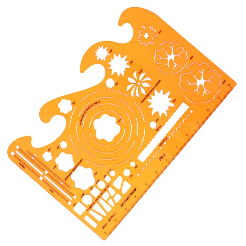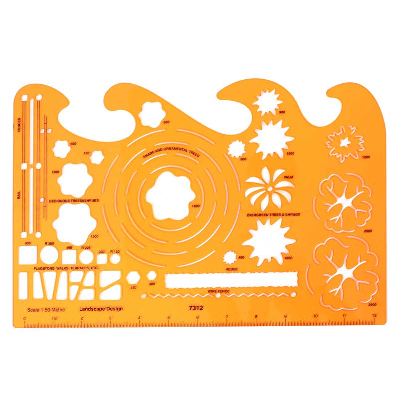 W szablonie znajdują się otwory z symbolami przedstawiającymi elementy przydatne w tworzeniu projektów ogrodów i terenów zielonych w skali 1:50. Zawiera kształty koron drzew, żywopłotów, elementy do rysowania ogrodzenia, poręczy i płyt chodnikowych.