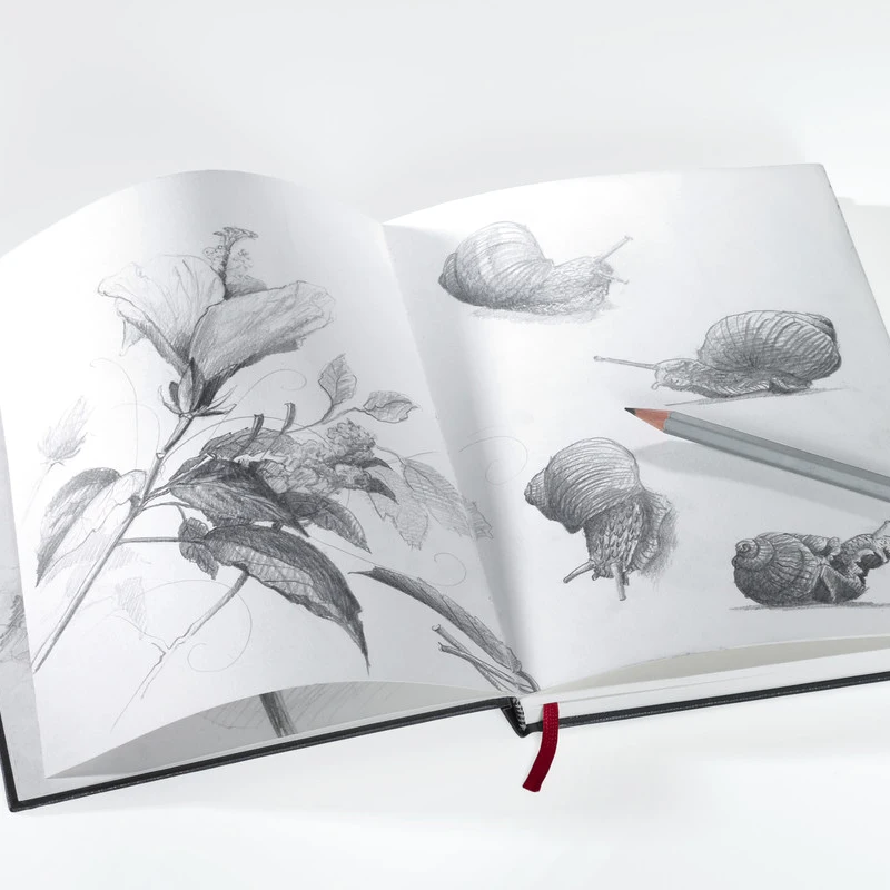 Szkicownik zszyty nicią rozkłada się całkowicie na płasko, co umożliwia swobodne rysowanie przez łączenie stron i po obu stronach kartki. Antracytowa okładka z lnianą strukturą jest wytrzymała, elegancka i przyjemna w dotyku - chroni zawartość i świetnie leży w dłoni podczas szkicowania.