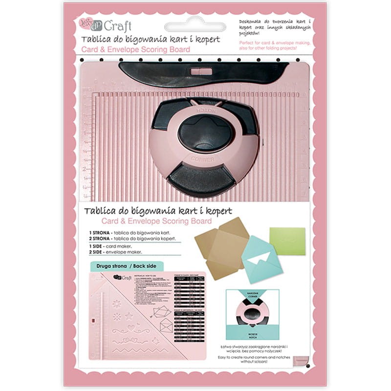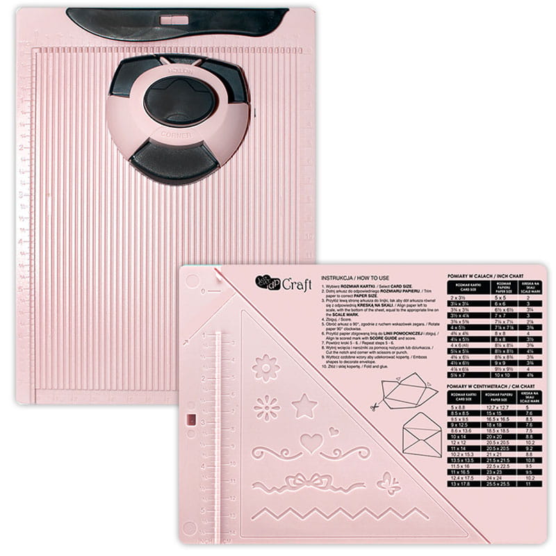 Wgłębienia znajdujące się na tablicy pozwalają na szybkie i precyzyjne tworzenie zagięć na papierze, a ozdobne wzory umiejscowione na odwrocie pozwalają na wytłoczenie elementów dekoracyjnych, które urozmaicą każdy projekt. Tablica do bigowania dpCraft jest wyposażona w linijki i tabele pomiarowe w centymetrach i calach.