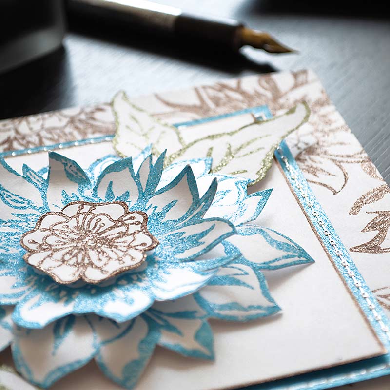 Tusz jest na bazie akrylowej co sprawia ze jest bardzo gęsty oraz dobrze kryje, dodatkowo połyskuje metalicznie więc dobrze wygląda na ciemnej powierzchni, a lekko wypukły, chropowaty w dotyku wzór odciśniętego stempla, sprawia wrażenie subtelnego reliefu.