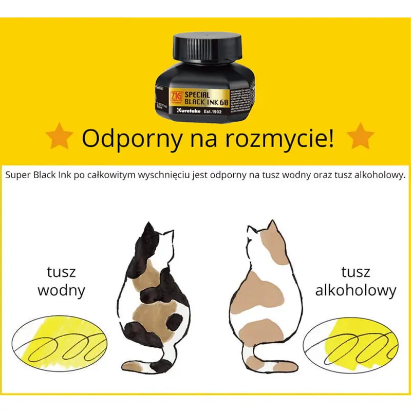 Tusz do kaligrafii Kuretake Zig Cartoonist to wyjątkowy tusz pigmentowy na bazie wody i żywicy syntetycznej, który zapewnia głęboką, matową czerń. Dzięki wysokiemu stężeniu pigmentów kreślone nim linie są wyraziste i odporne na blaknięcie, a po wyschnięciu tusz staje się wodoodporny i odporny na alkoholowe markery, akwarele, wodę i ścieranie gumką.