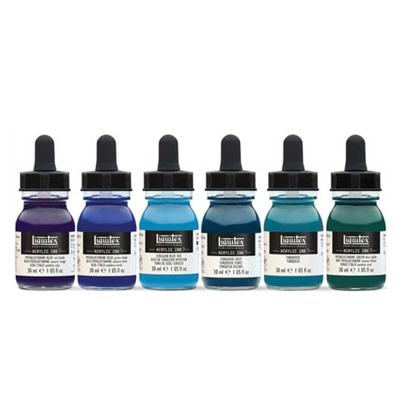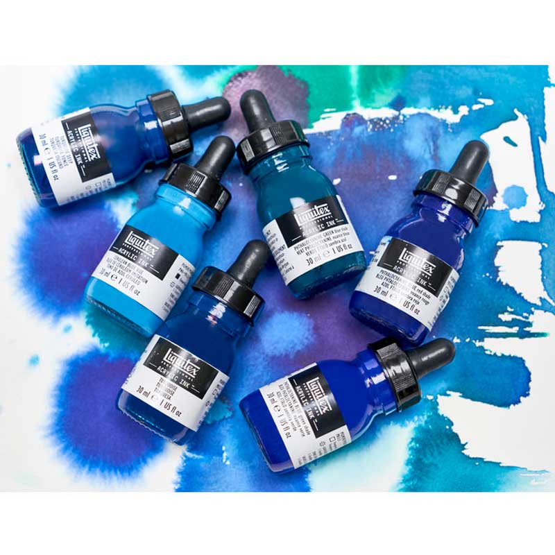 Profesjonalne tusze akrylowe wytwarzane z wysokiej jakości składników. Cechują się intensywnymi, świetlistymi kolorami w odcieniach błękitu. Są permanentne i nieblaknące. Tusze Liquitex Acrylic Ink szybko schną, a po wyschnięciu stają się wodoodporne. Kolejne warstwy można nakładać bez strachu o połączenie się i pobrudzenie kolorów.