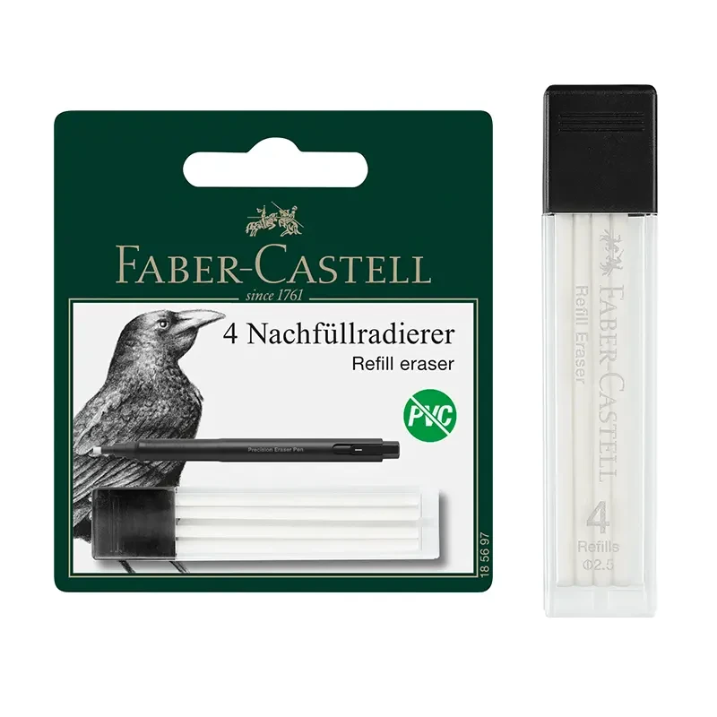 Zapasowe wkłady do gumki precyzyjnej Faber-Castell o średnicy 2.5 mm. Pasują do mechanicznej gumki wysuwanej tej samej marki.