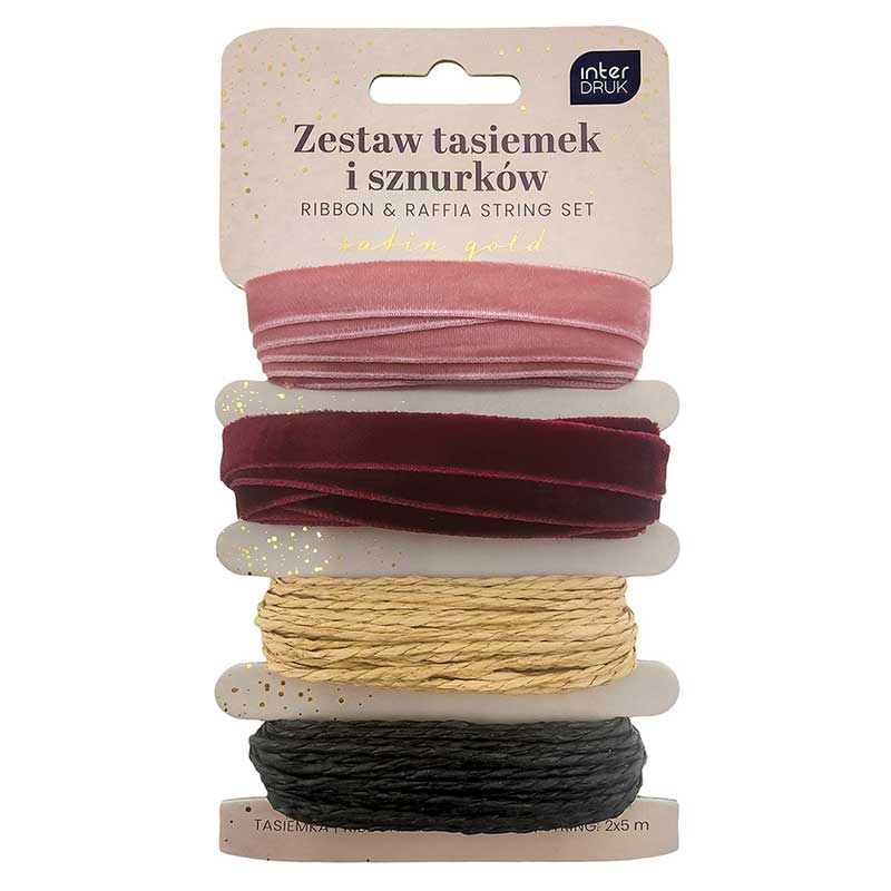 Opakowanie zawiera 2 kolory welurowych tasiemek oraz 2 kolory papierowych sznurków. Długość tasiemki 2 m, długość sznurka 5 m.