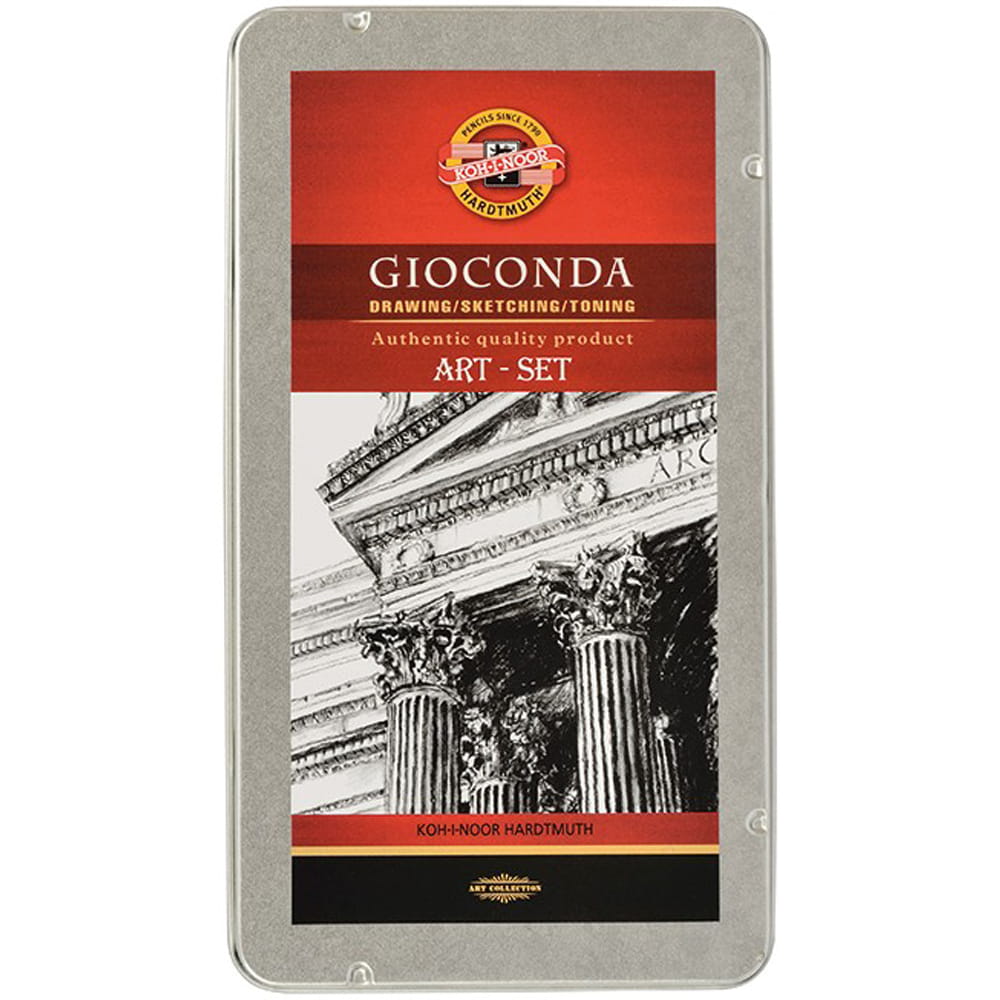 Artystyczny zestaw do rysunku Gioconda 8893 firmy Koh-I-Noor w eleganckiej metalowej kasetce. Zestaw zawiera pełną gamę produktów potrzebnych do stworzenia ciekawych rysunków czy szkiców, znajdują się w nim zarówno ołówki klasyczne, ołówki akwarelowe do pracy z wodą, ołówek bezdrzewny sztyfty grafitowe jak i gumka oraz wiszer do tworzenia efektów miękkich przejść gradientowych. Zestaw zamknięty w metalowym pudełku sprawdzi się w plenerze oraz w podróży.