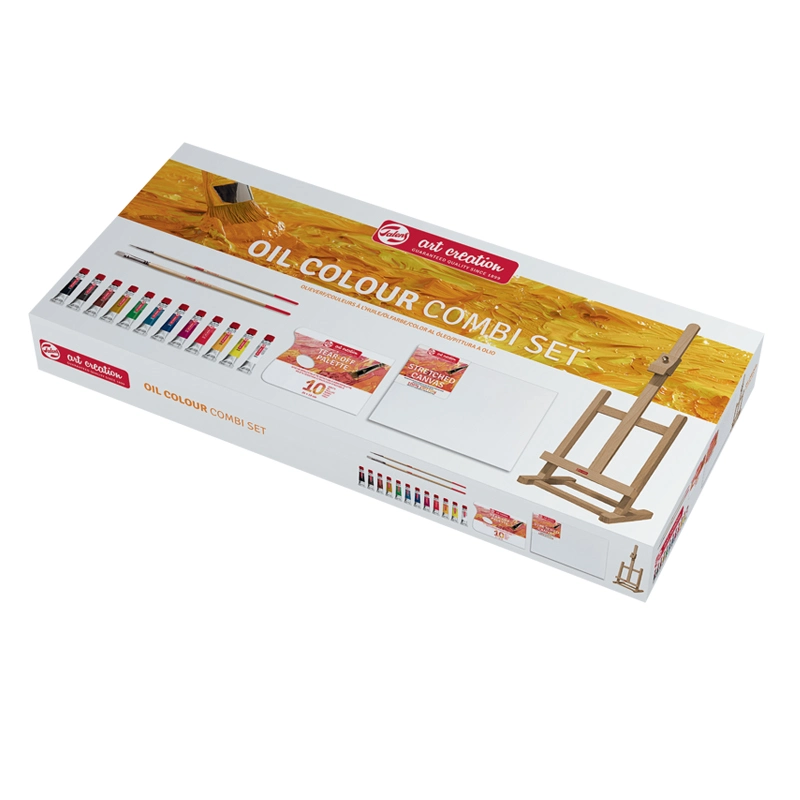 Zestaw farb olejnych Art Creation Talens Oil Colour Combi Set to doskonały zestaw bazowy do malarstwa olejnego, idealny dla początkujących artystów, hobbistów oraz uczniów szkół artystycznych. Farby Art Creation Talens Oil Colour to dobra jakość w przystępnej cenie, seria spełniająca standardy jakościowe charakterystyczne dla holenderskiej marki Talens. Kolory farb olejnych w zestawie zostały dobrane tak, aby umożliwić tworzenie pełnej palety barwnej poprzez mieszanie podstawowych odcieni. Dodatkowo w komplecie dodano drewniana sztaluga stołową, która stanowi idealną podporę do malarstwa na mniejszych formatach.