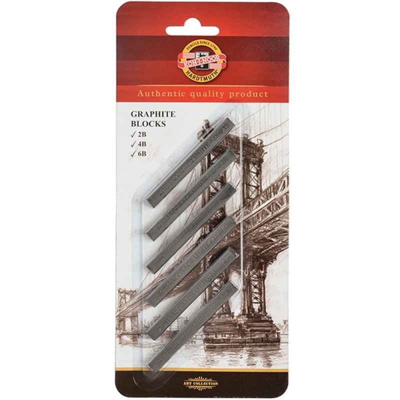 Komplet sztyftów grafitowych o twardości od 2B do 6B. Zestaw Graphite od firmy Koh-I-Noor zawiera 6 szt. grafitowych bloczków po 2 sztuki z twardości 2B, 4B, 6B. Sztyfty grafitu doskonale sprawdzą się do swobodnych szkiców, cieniowania oraz zarysowywania większych płaszczyzn rysunku. Pozwalają na pełną swobodę ekspresji rysunkowej, od ostrej linii po plamę tonalną wykonaną płaszczyzną sztyftu grafitowego. Wymiary pojedynczego bloczku grafitowego to 7x7x70 mm.