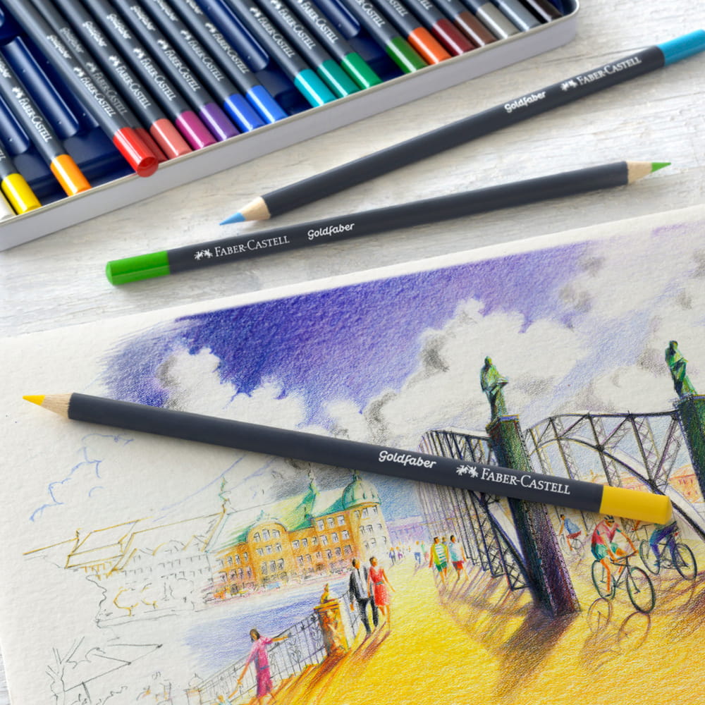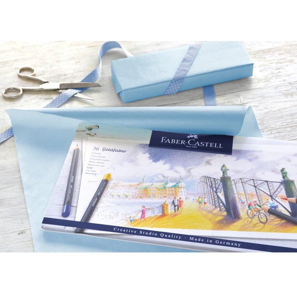 Kredki Goldfaber 36 szt. niemieckiej firmy Faber Castell. Kredki charakteryzują się wyjątkowo miękkim grafitem i zachwycają intensywnością kolorów. Wysokiej jakości materiały oraz produkcja z wykorzystaniem najbardziej innowacyjnych technologii zapewnia maksymalną odporność na złamania, doskonała światłoodporność, wyjątkową intensywność kolorów, wodoodporność, a także sprawia, że kredki nie kruszą się i nie pozostawiają niechcianych smug. Szybkie szkice, cieniowanie, czy płynne tonowanie kolorów – doskonałe do wszystkie techniki rysowania bez wysiłku. Dobrze napigmentowany grafit grubości 3,3 mm zamknięty w owalnej, drewnianej oprawce. Zestaw w metalowym opakowaniu zawiera 36 kolorów.