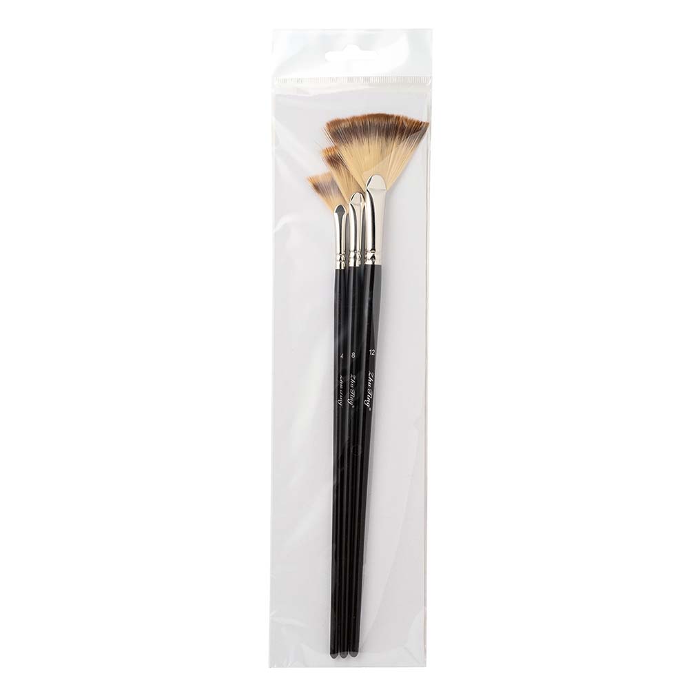 Zestaw pędzli wachlarzowych firmy Renesans z syntetycznym włosiem, osadzonym w długim lakierowanym trzonku. Zestaw zawiera pędzle o rozmiarach: 4, 8, 12.