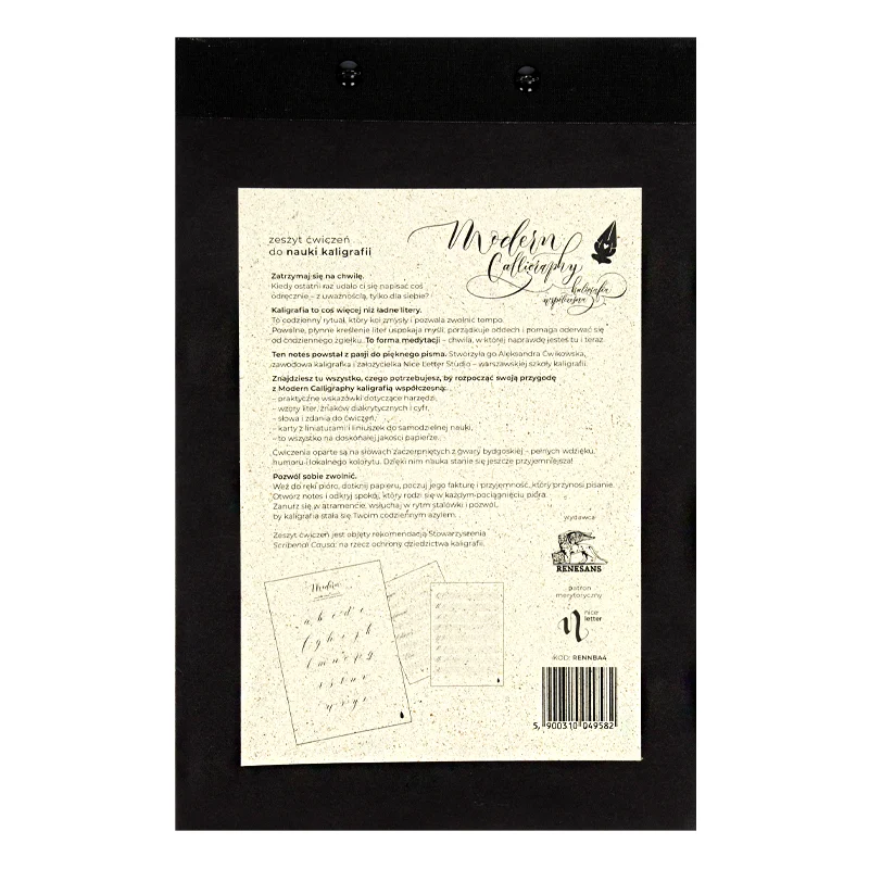 Zeszyt ćwiczeń do nauki kaligrafii nowoczesnej Modern Calligraphy to publikacja stworzona z pasji do pięknego pisma. Autorką jest Aleksandra Ćwikowska – zawodowa kaligrafka i założycielka Nice Letter Studio, warszawskiej szkoły kaligrafii. Wydany przez markę Renesans zeszyt stanowi kompleksowe wprowadzenie do kaligrafii stylu Modern.